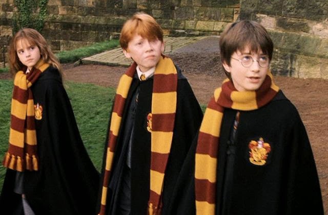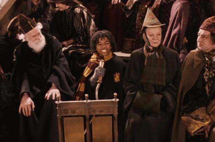 Hogwarts students stay warm and support their teams by donning house scarves in the colors of their houses. These iconic knit scarves have become emblematic of the Harry Potter films. While these scarves aren’t reserved only for quidditch, and we certainly see students wearing them on other occasions, they are undoubtedly most popular in the quidditch stands. The design of the scarves does change slightly over the saga, from blocky, even stripes to a thin double stripe pattern, but the donning of the house scarf remains a popular sartorial choice for Hogwarts quidditch fans.