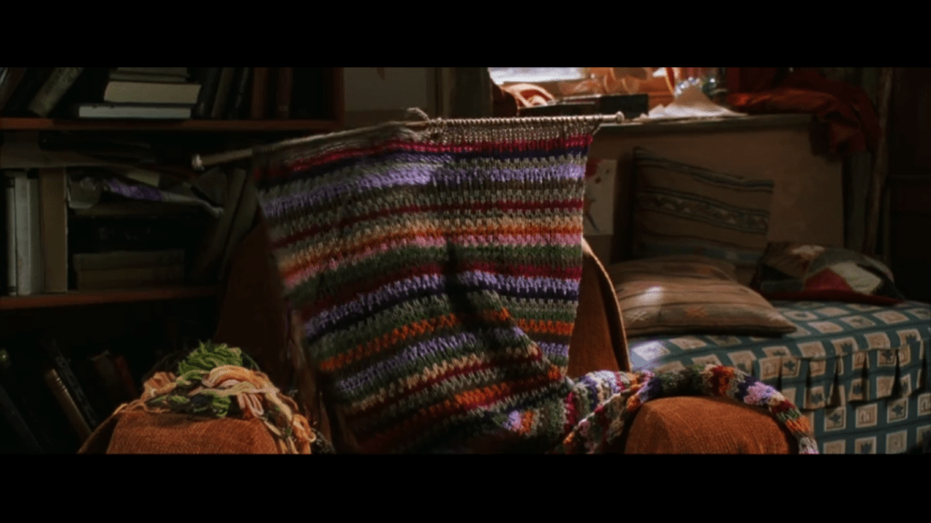 When I look at this film still, this blanket actually looks a lot more like one that has been crocheted than knitted, despite the magical knitting needles doing the work, but I could be wrong! Maybe magical knitting needles can also crochet?